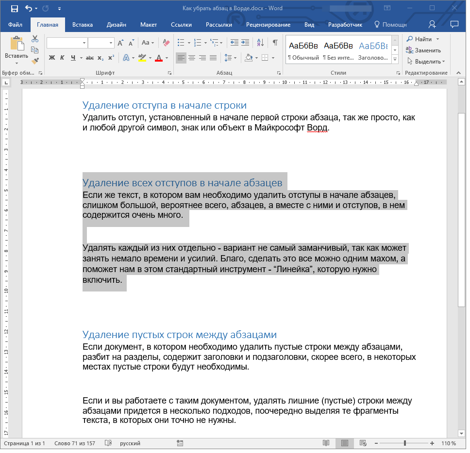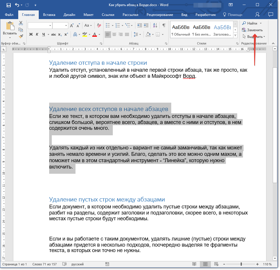 Если документ, в котором необходимо удалить пустые строки между абзацами, разбит на разделы, содержит заголовки и подзаголовки, скорее всего, в некоторых местах пустые строки будут необходимы. Если и вы работаете с таким документом, удалять лишние (пустые) строки между абзацами придется в несколько подходов, поочередно выделяя те фрагменты текста, в которых они точно не нужны.