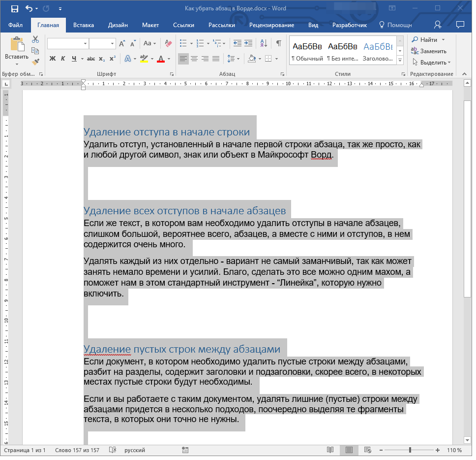 Как видите, все предельно просто, по крайней мере, если давать правильный ответ на вопрос “Как убрать отступы абзацев в Ворде”. Однако, многие пользователи под этим подразумевают немного иную задачу, а именно, удаление лишних отступов между абзацами. Речь в данном случае идет не о самом интервале, а о пустой строке, добавленной двойным нажатием клавиши Enter в конце последней строки абзацев в документе.