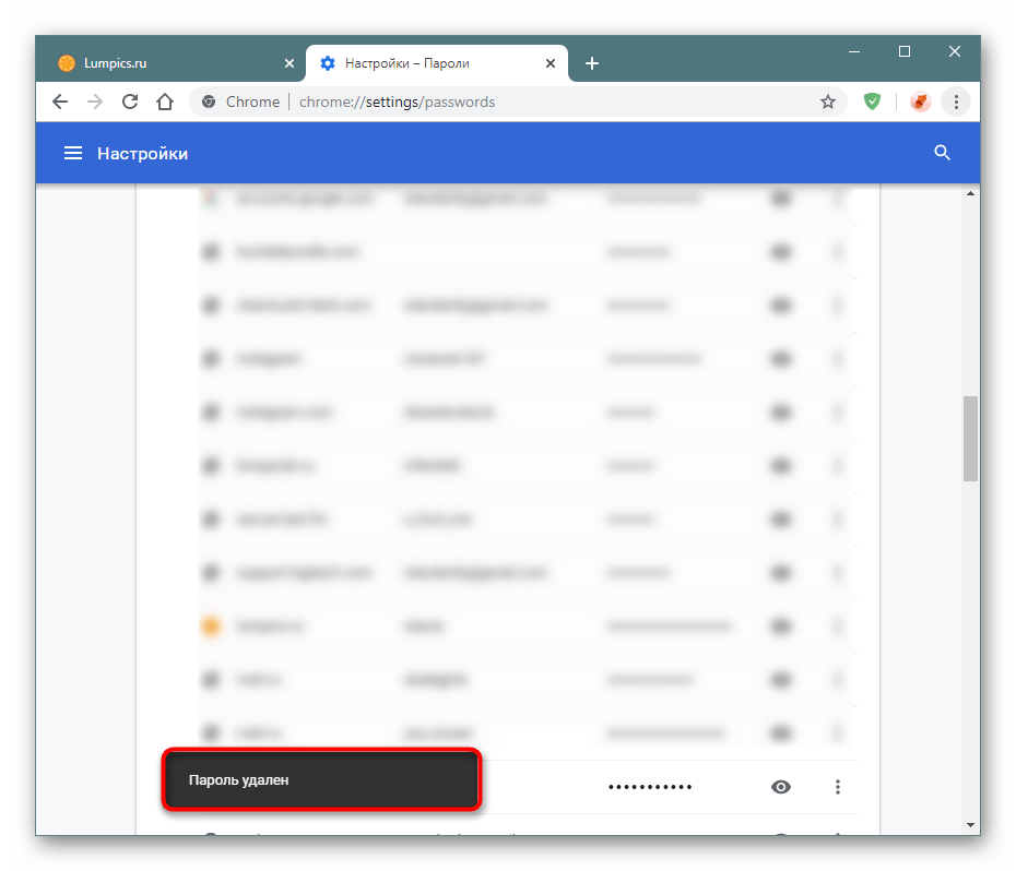 При необходимости выполнить удаление сразу нескольких паролей, понадобится повторить этот же алгоритм: выделить несколько строк одновременно нельзя. Вы также не сможете отредактировать ключ, поэтому если он был сохранен с ошибкой, понадобится сперва удалить его, а затем сохранить новый заново. Когда нужно удалить сразу все пароли, воспользуйтесь инструкцией ниже.