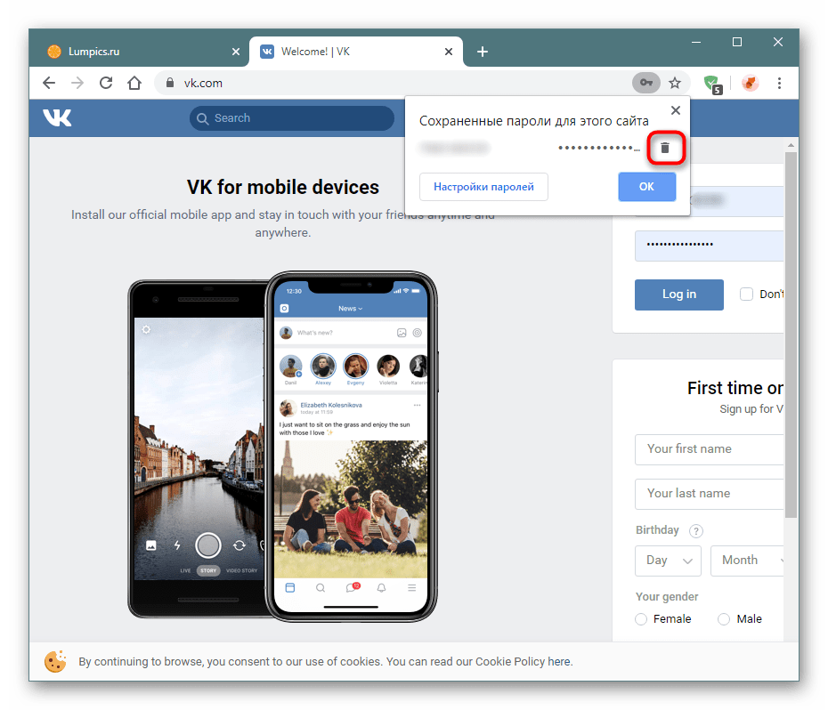 Нажмите на него, чтобы появилось окно, предлагающее больше действий. Щелкните по иконке с корзиной для удаления пароля. Больше для этого веб-адреса форма авторизации не станет заполняться автоматически до тех пор, пока комбинация логин/пароль снова не будет сохранена.