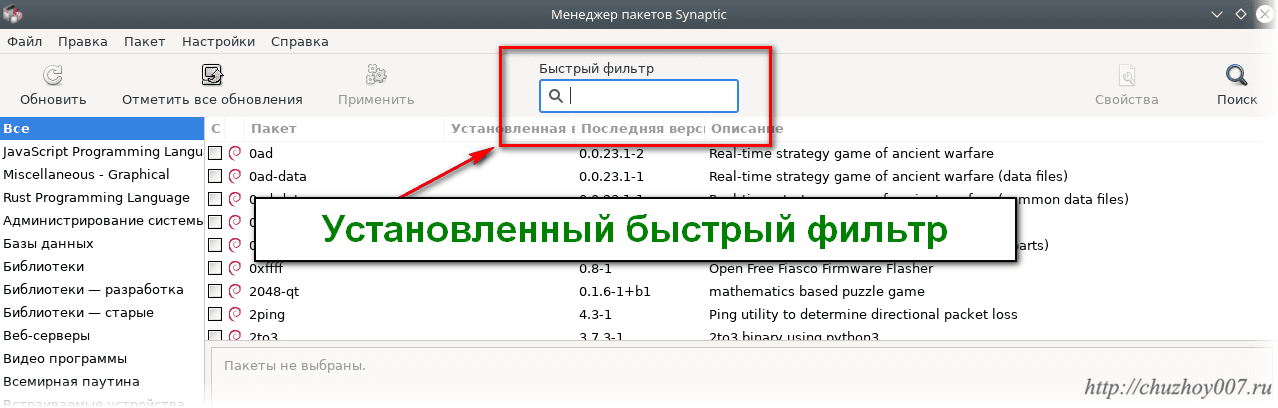 Synaptic безусловно удобная программа для установки приложений в линукс но для еще большей функциональности предлагаю добавить быстрый фильтр. Он позволит искать нужные программы и пакеты сразу после запуска без необходимости отрывания окна поиска. Итак, нужно установить пакет