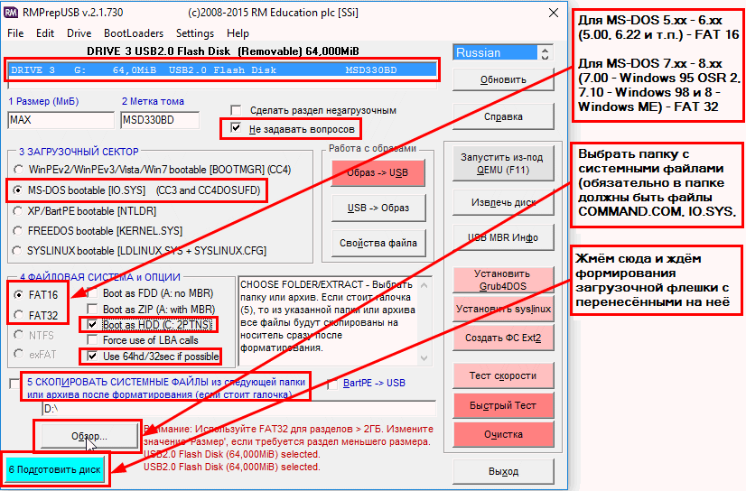 Создавать загрузочную флешку dos мы будем с использованием замечательного набора утилит RMPrepUSB and RMPartUSB (http://www.rmprepusb.com). Архив с программой RMPrepUSB можно скачать у нас (ссылка в конце статьи, файл MS-DOS USB FLASH.rar). В архиве: папка RMPrepUSB — непосредственно утилита. Отдельная директория (!!!MS-DOS-ver.5-7!!!) содержит операционки различных версий. Так как мы устанавливаем MS-DOS 6.22, нам понадобятся файлы в папках ms-dos6.22-vc-1×1.44 и ms-dos6.22-vc-min-1×1.44.