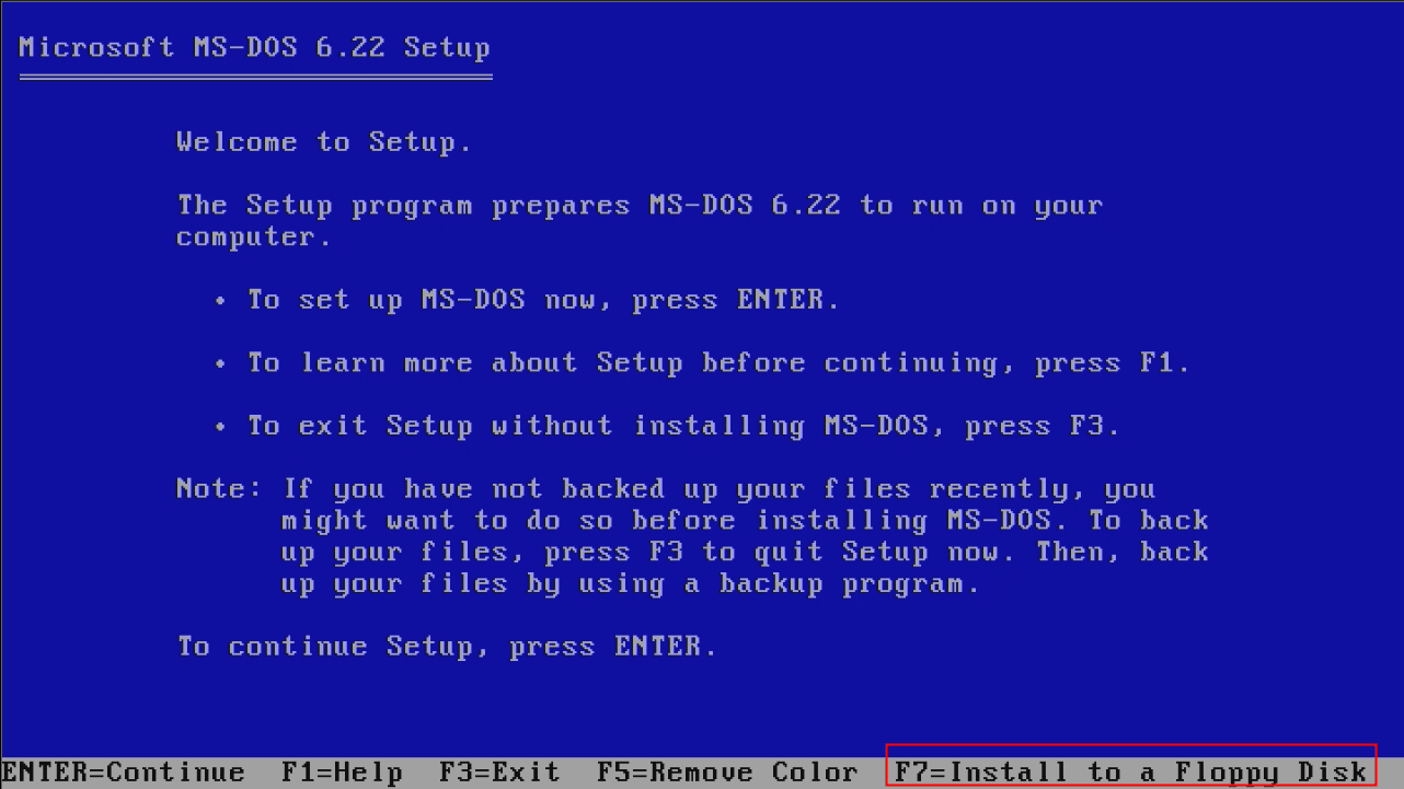 Чтобы установить операционную систему MS-DOS 6.22 с использованием комплекта установочных флоппи дисков на один флоппи диск, необходимо выбрать эту возможность в начале установки, нажав клавишу F7 (о чем вам будет сообщено надписью на английском на начальном этапе установки).
