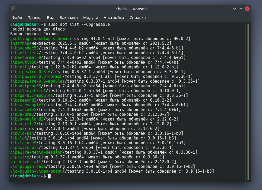 | apt list | Вывод списка установленных и доступных для обновления пакетов. |