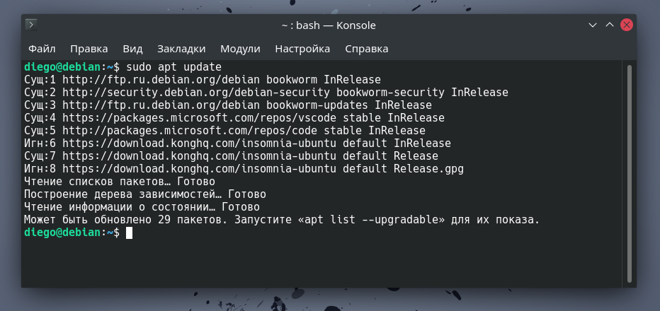 | apt update | apt-get update | Обновление списка доступных пакетов. |