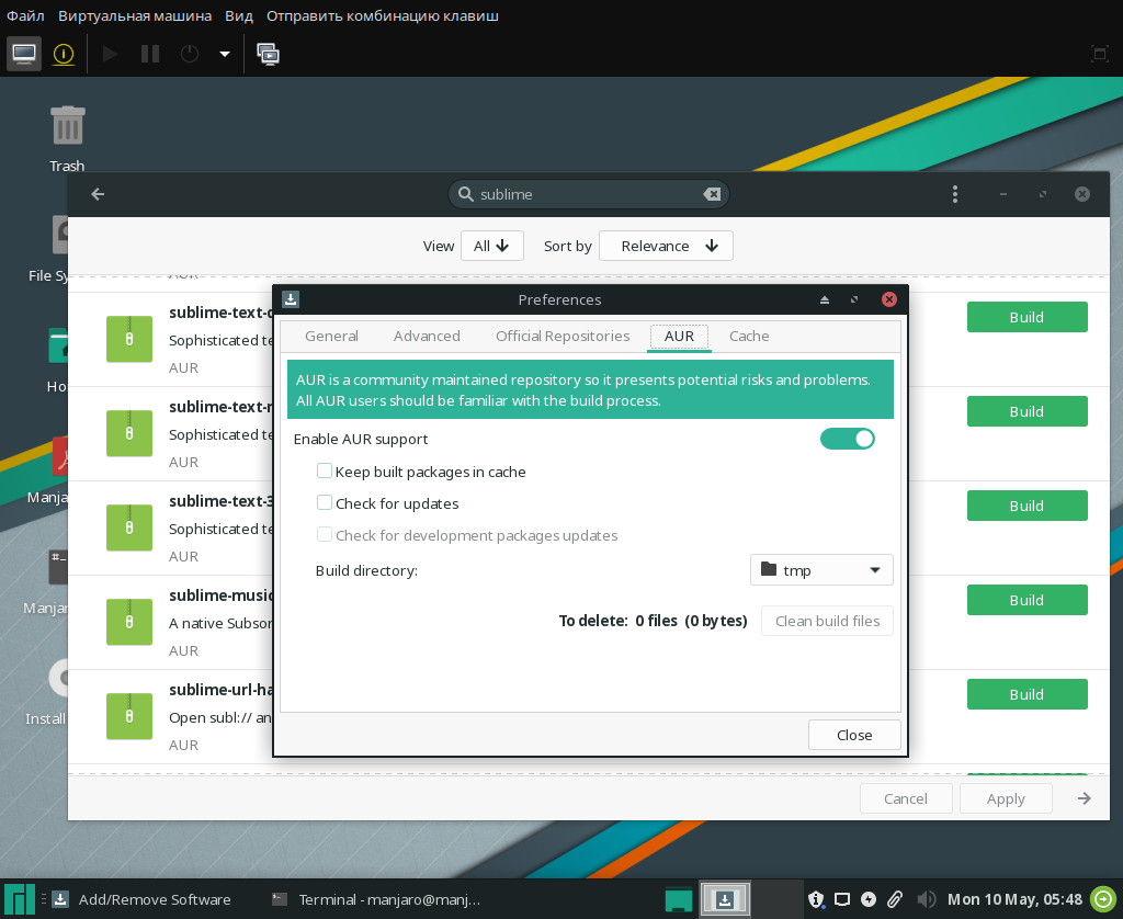Установить Sublime Text в дистрибутивах основанных на Arch, а именно в Manjaro можно несколькими способами, первый из репозитория AUR. Для этого необходимо разумеется его включить в настройках, а затем в поисковой строке набрать Sublime Text и выбрать один из вариантов установки. Тут так же имеется стабильная версия (Stable) и версия для разработчиков (Dev):