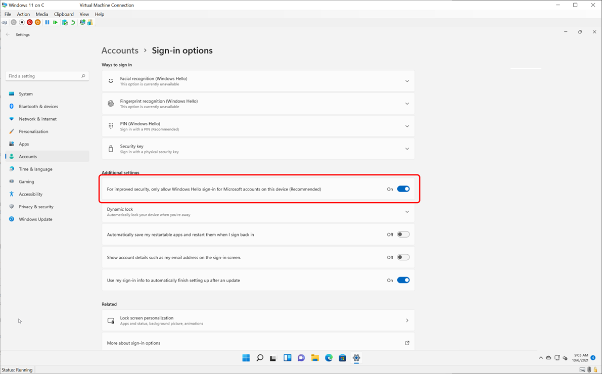Для более поздних версий, чем Windows 10, версия 2004, потребуется дополнительный параметр. К таким версиям относится и Windows 11. Если в окне подключения виртуальной машины отображается фон без запроса на вход, необходимо внести еще одно изменение.