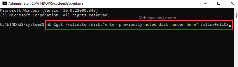 mbr2gpt /validate /disk:*enter previously noted disk number here* /allowFullOS