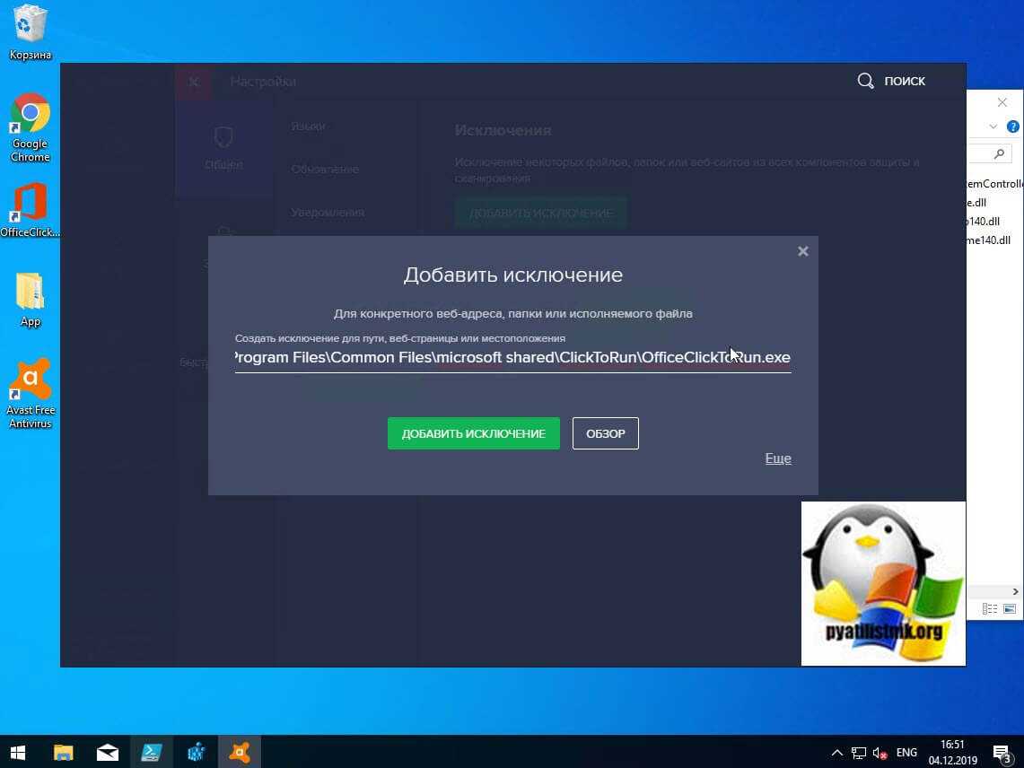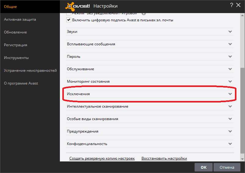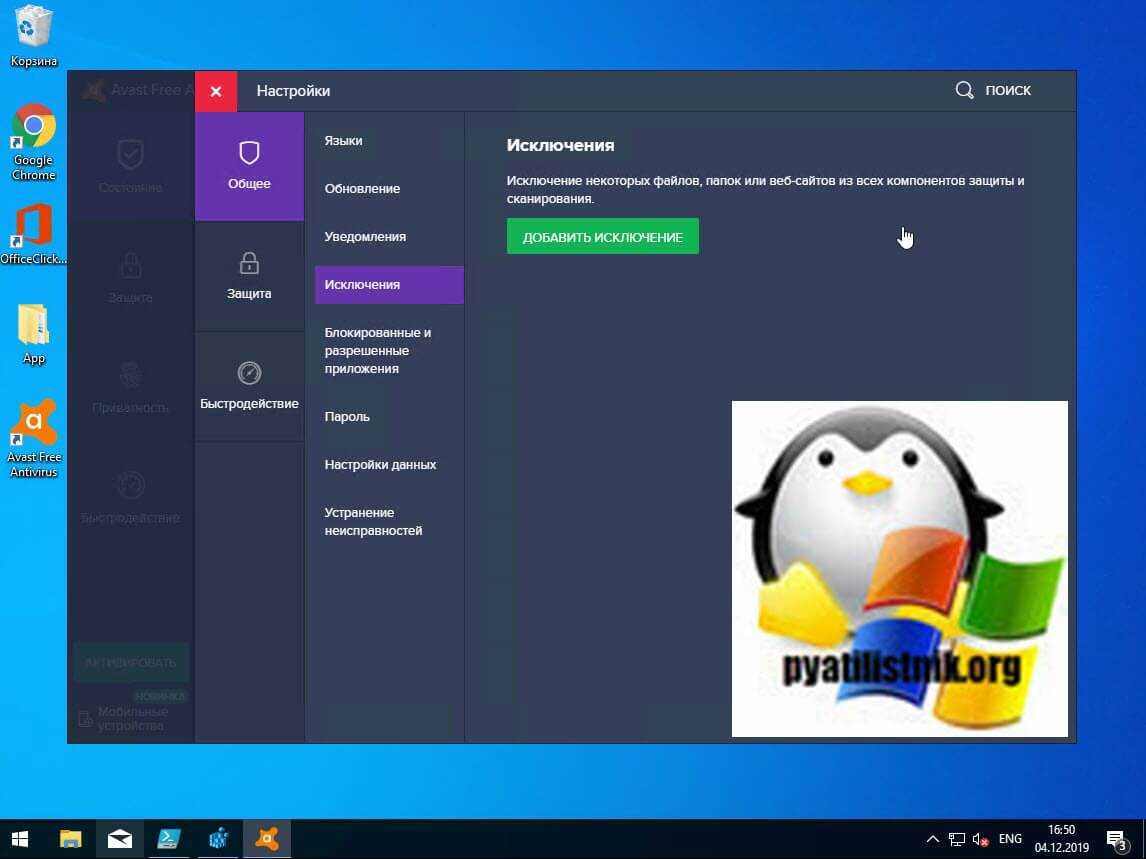 Далее если блокировку вызывал антивирус, в моем примере Avast, то идем в его настройки и добавляем исключение, путь до нашего файла, чтобы антивирус его не трогал и признавал за своего.