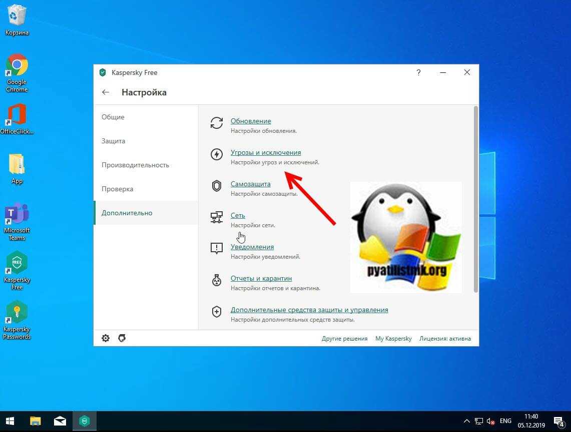 Чтобы исключить нужный исполняемый файл вам необходимо открыть настройки Kaspersky, перейти в раздел «Дополнительно» и выбрать там пункт «Угрозы и исключения».