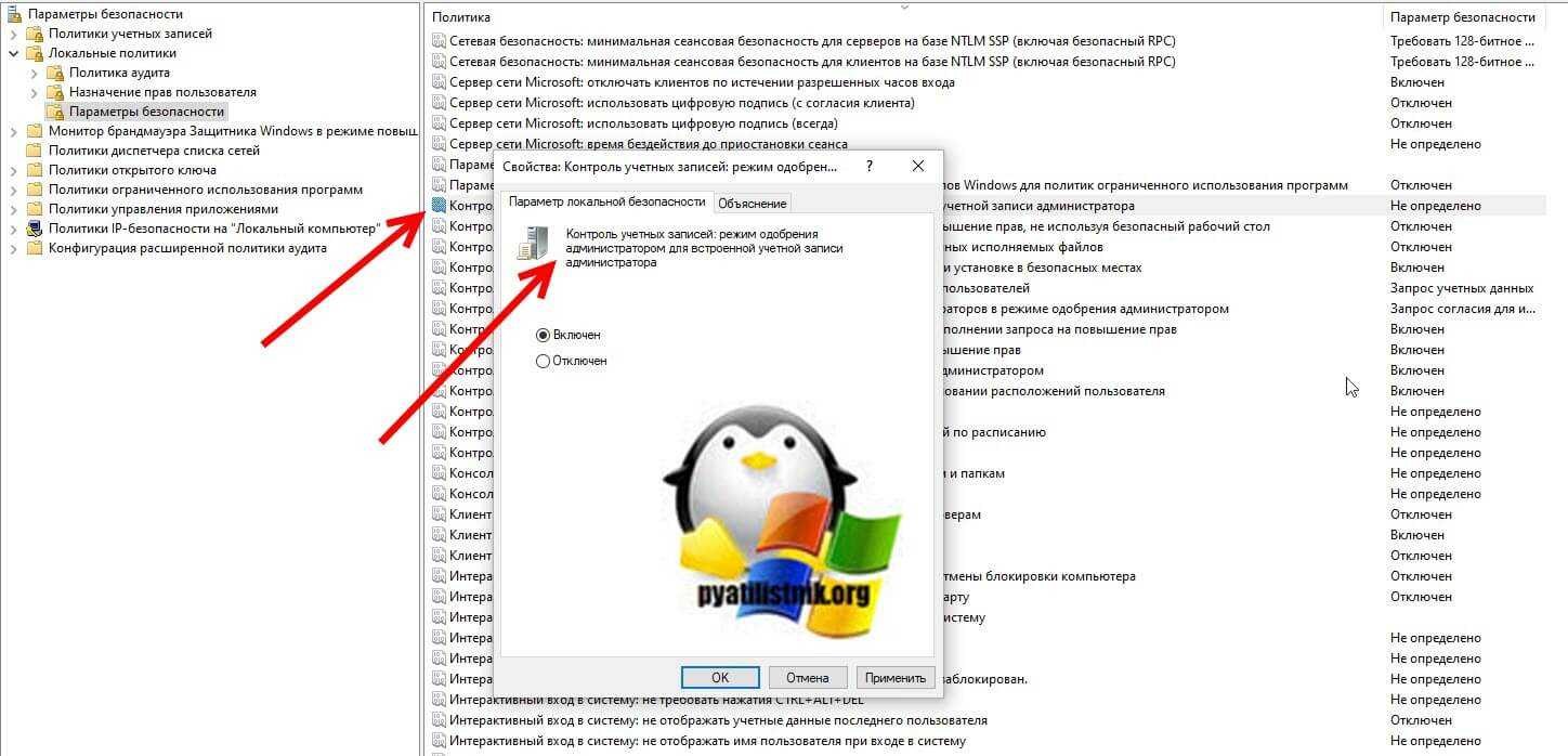 • Включено. Для встроенной учетной записи администратора используется режим одобрения администратором. По умолчанию любая операция, требующая повышения привилегий, предлагает пользователю подтвердить операцию.