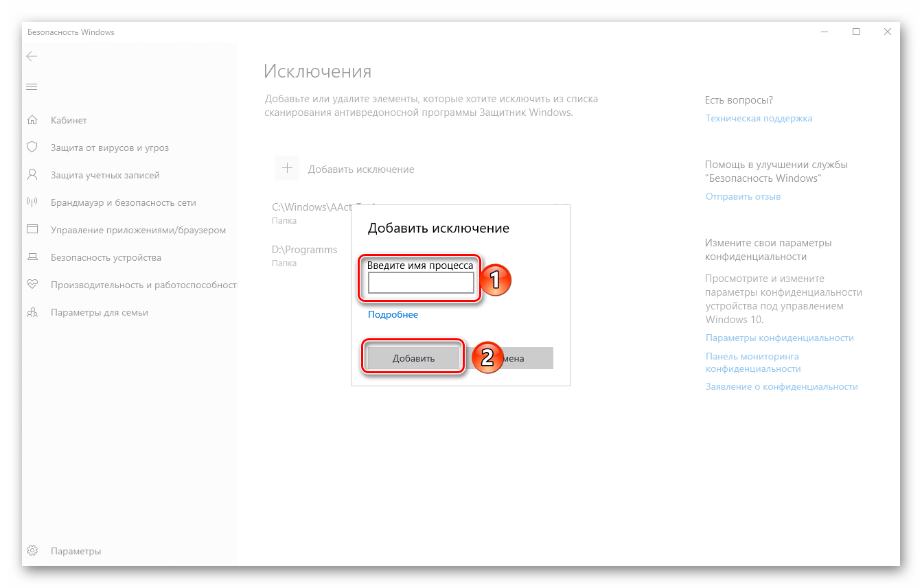 Стандартный для десятой версии антивирус по большинству параметров и функциональных возможностей не уступает решениям от сторонних разработчиков. Как и все рассмотренные выше продукты, он тоже позволяет создавать исключения, причем внести в этот список можно не только файлы и папки, но и процессы, а также конкретные расширения.