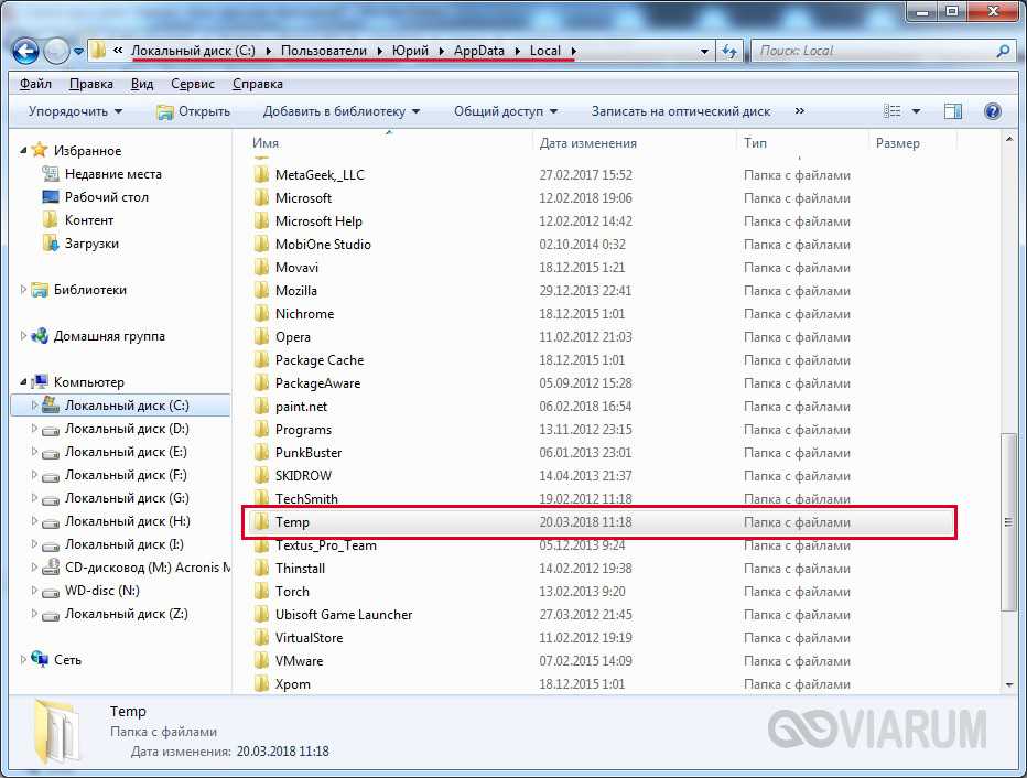 Все, теперь мы без труда сможем найти папку Temp. В Windows Vista, 7, 8 и 10 она расположена в каталоге AppData профиля пользователя, а конкретно по адресу:
