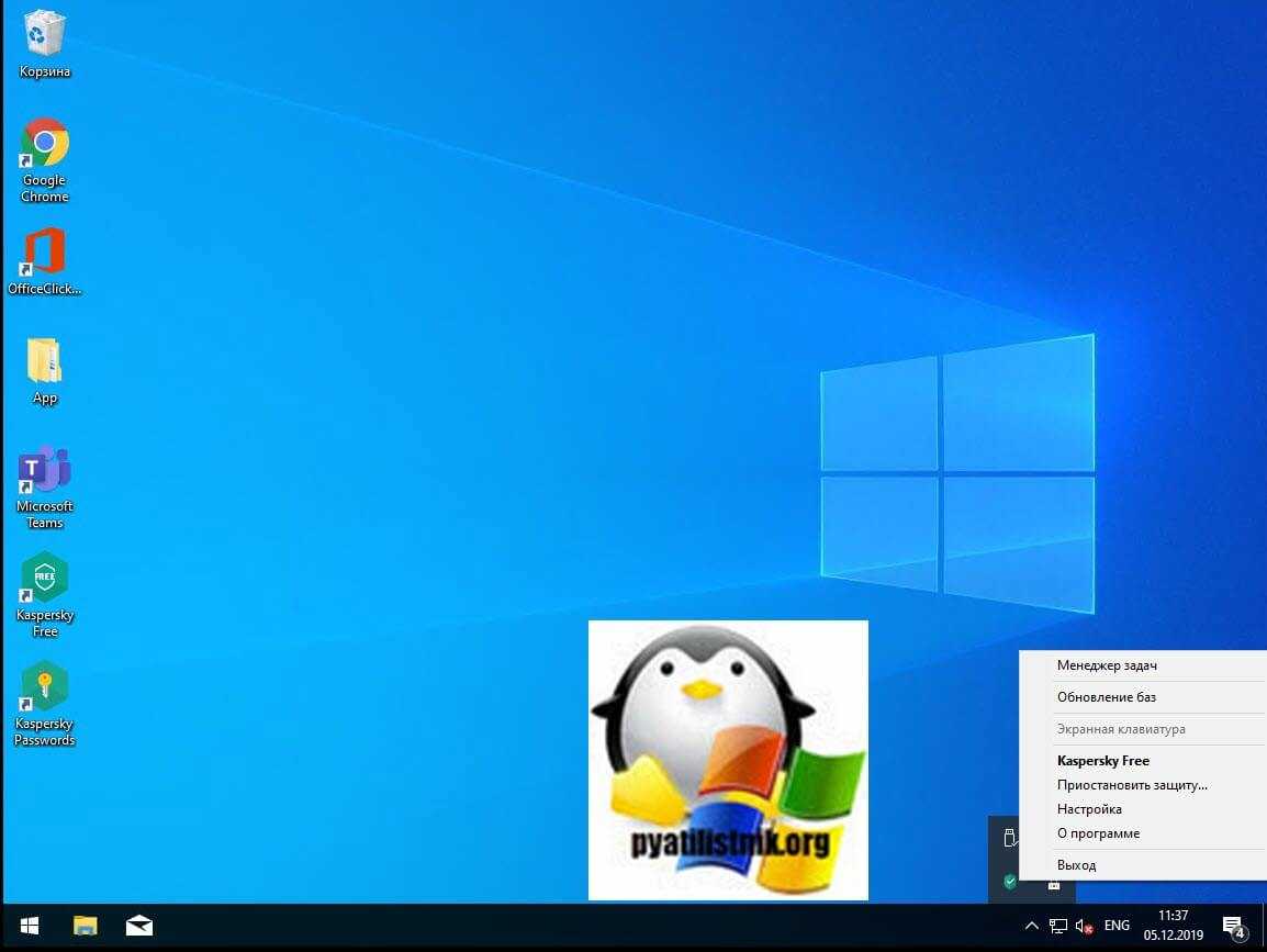 То же самое можно осуществить и в распространенном антивирусе Kaspersky, для этого также в области системных уведомлений найдите его значок и из контекстного меню выберите пункт «Приостановить защиту».