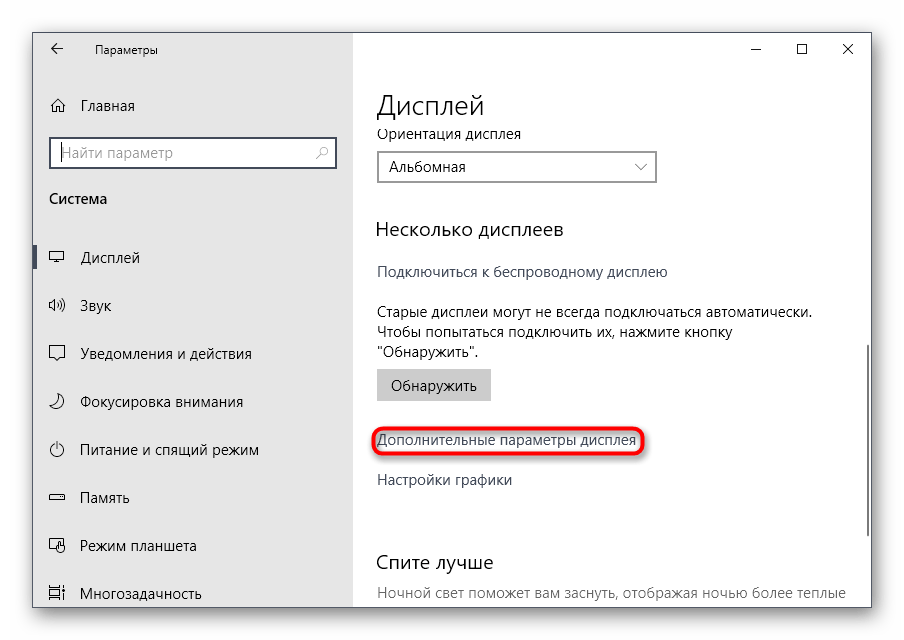 В категории «Дисплей» опуститесь ниже и отыщите кликабельную строку «Дополнительные параметры дисплея».