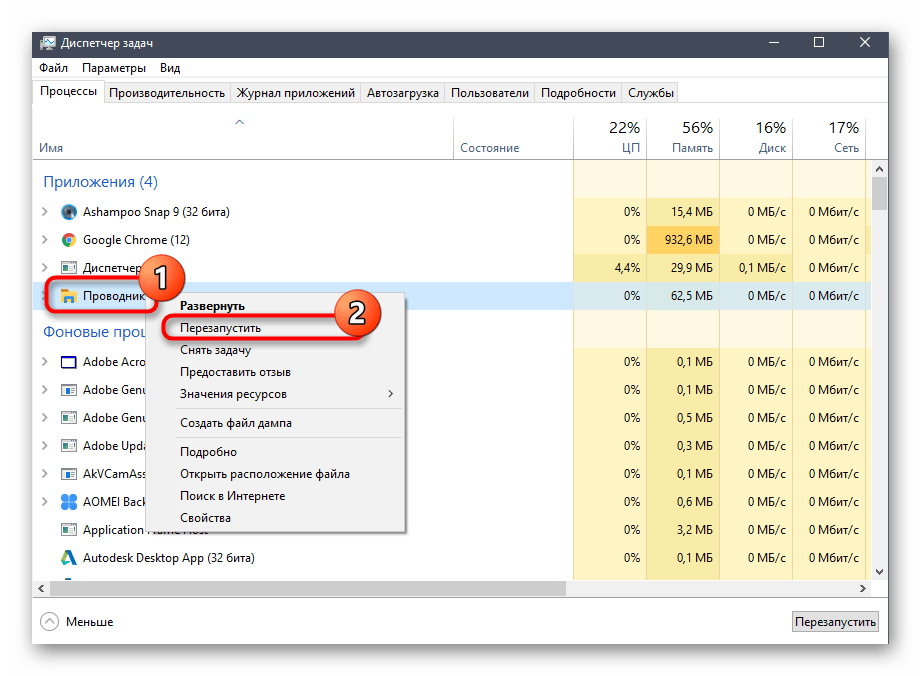 Когда в папке отображаются неточные результаты или вовсе никакие файлы невозможно найти, для исправления ошибки перезапускается «Проводник» – в списке процессов найти утилиту, правой кнопкой вызвать ее свойства и активировать опцию перезапуска. На несколько секунд панель задач и рабочий стол исчезнут, а затем снова появятся.