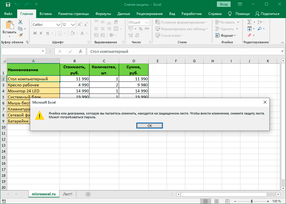 Снимаем защиту с листа
