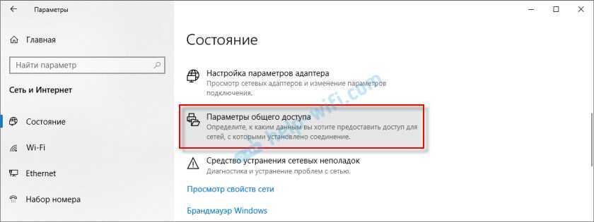 Нам нужно открыть окно «Дополнительные параметры общего доступа». Это можно сделать через «Центр управления сетями и общим доступом», или в параметрах, в разделе «Сеть и Интернет» – «Параметры общего доступа».