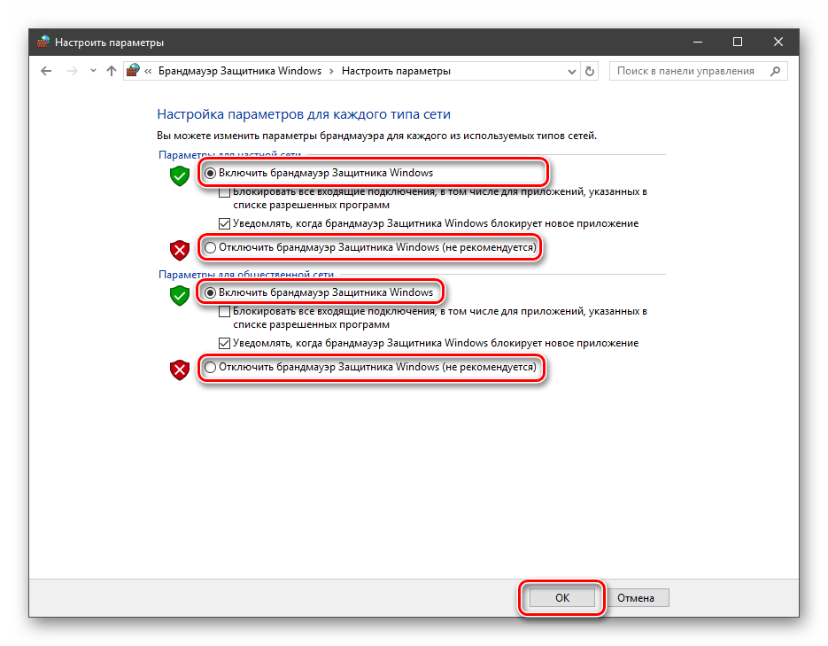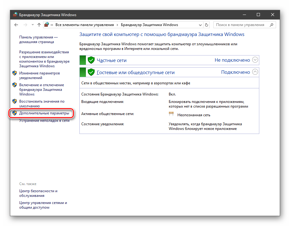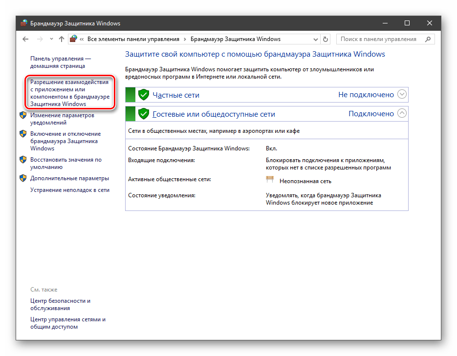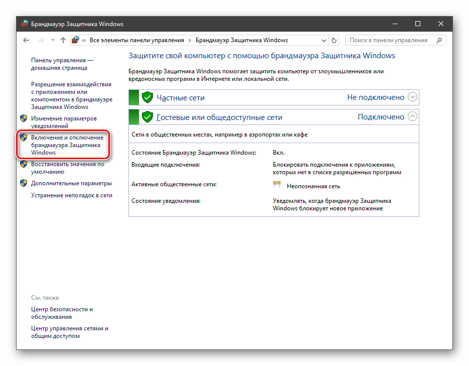 Активировать брандмауэр или отключить его можно, перейдя по соответствующей ссылке в разделе настроек: