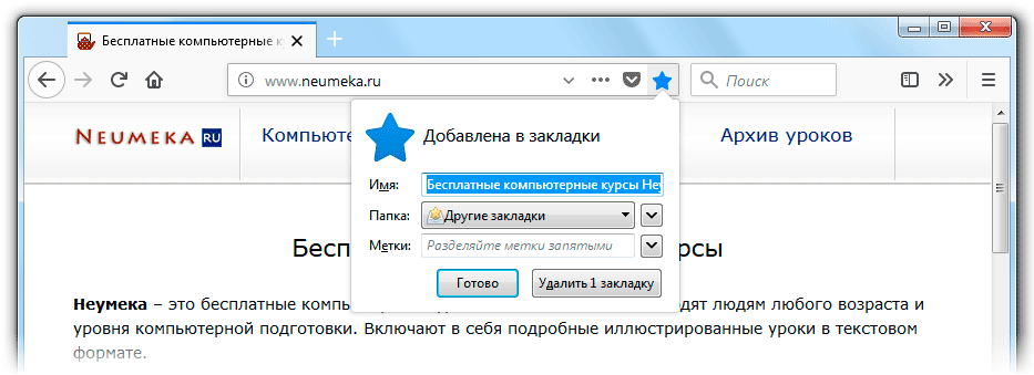 Появится окошко, в котором написано, что закладка добавлена. Это значит, браузер запомнил данный сайт.