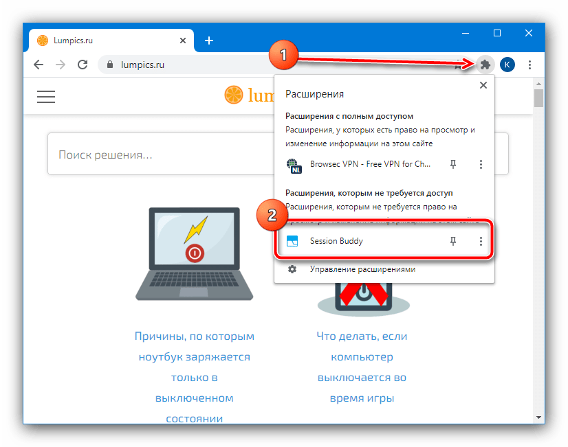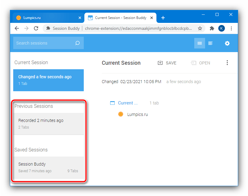 Расширенные возможности сохранения вкладок реализованы посредством разнообразных плагинов и аддонов. Большинство современных браузеров поддерживают дополнения, поэтому работу с ними покажем на примере Google Chrome и решения SessionBuddy.