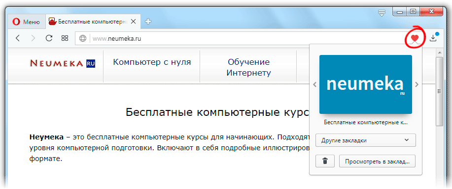 Opera. Принцип закрепления вкладок в Опере почти такой же, как и в Google Chrome. Нажимаем на картинку с сердечком в конце адресной строки и получаем окошко закрепления.