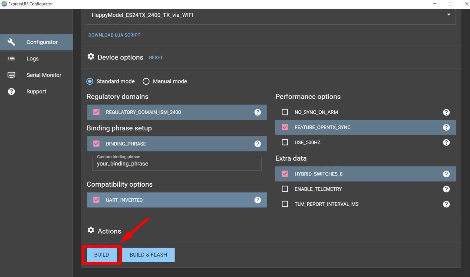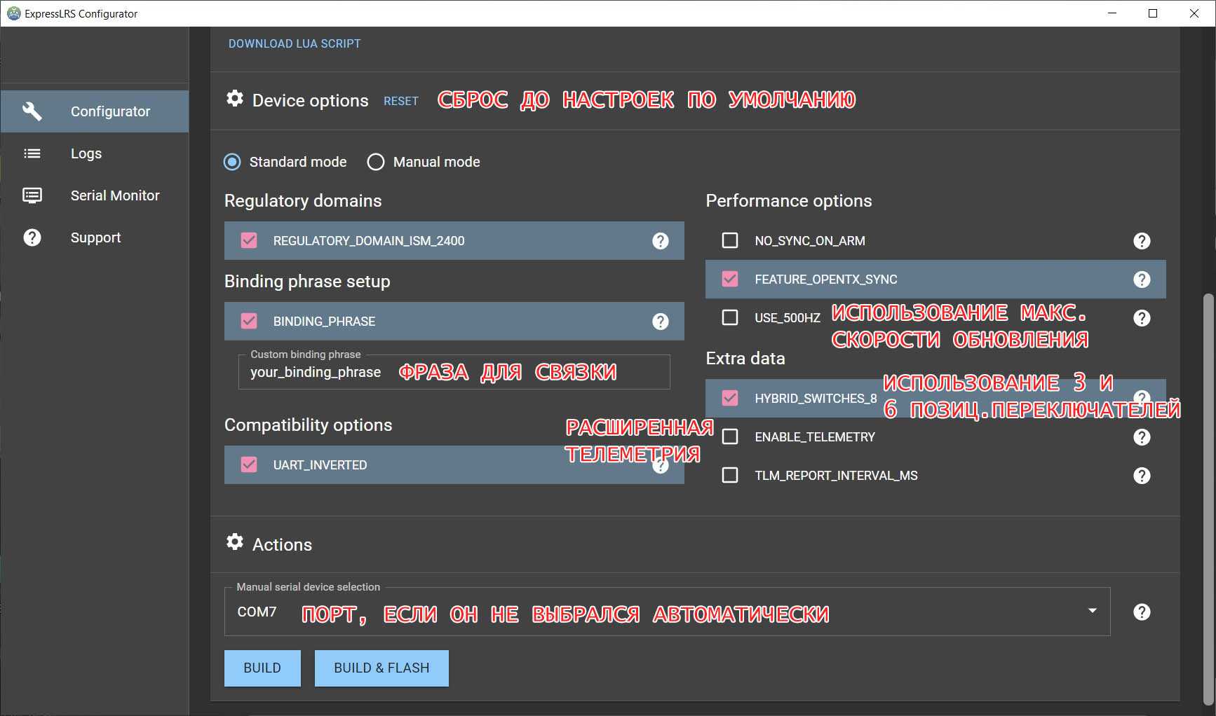 Если вы выбрали прошивку через «_via_UART», то можете сразу нажать кнопку , чтобы собрать и прошить модуль. Перед этим шагом модуль передатчика должен быть подключен к ПК через USB-кабель.