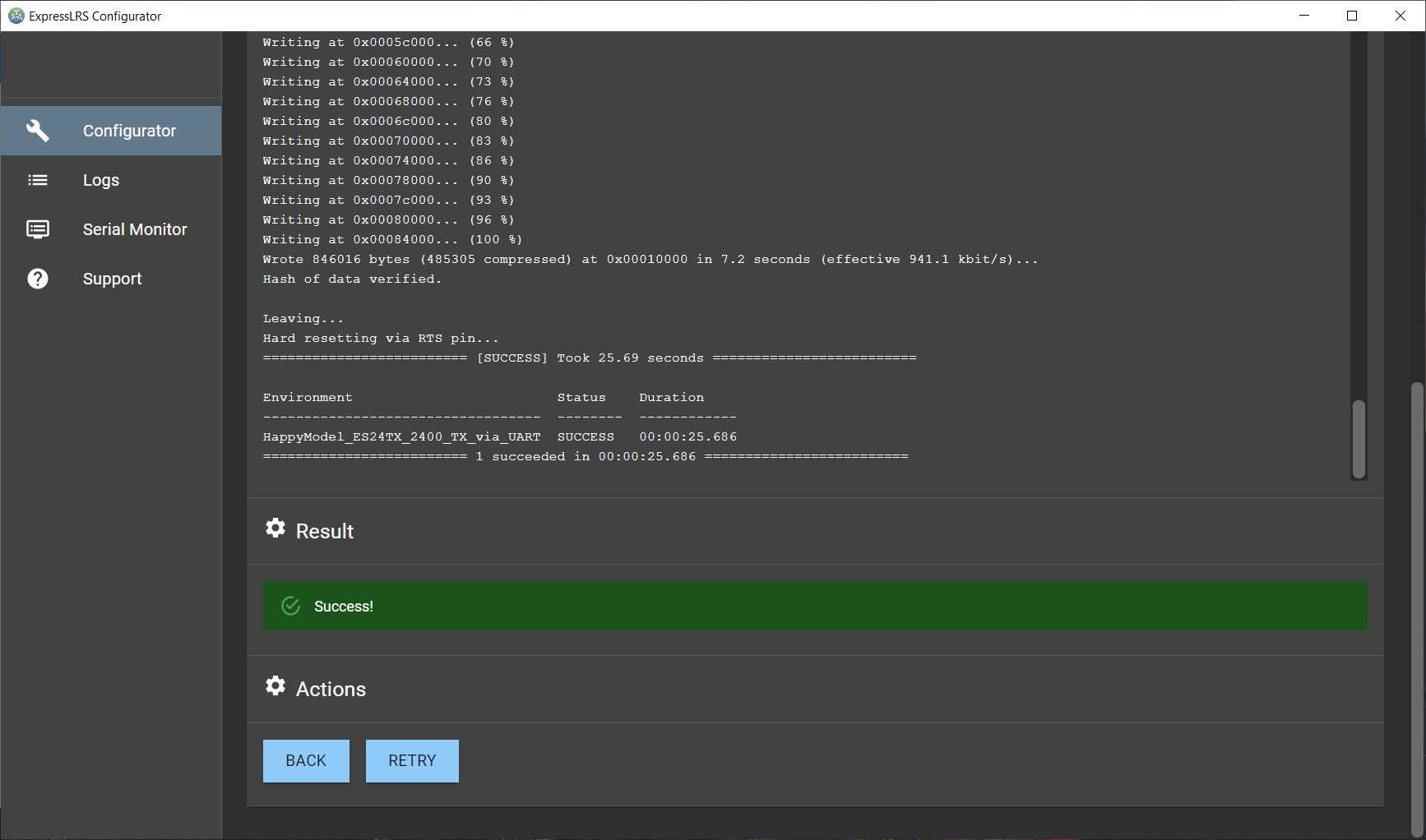 Конфигуратор соберет прошивку, а затем автоматически обнаружит последовательный порт, модуль передатчика должен быть подключен. Как только все будет собрано и порт обнаружен, начнется автоматическая прошивка.