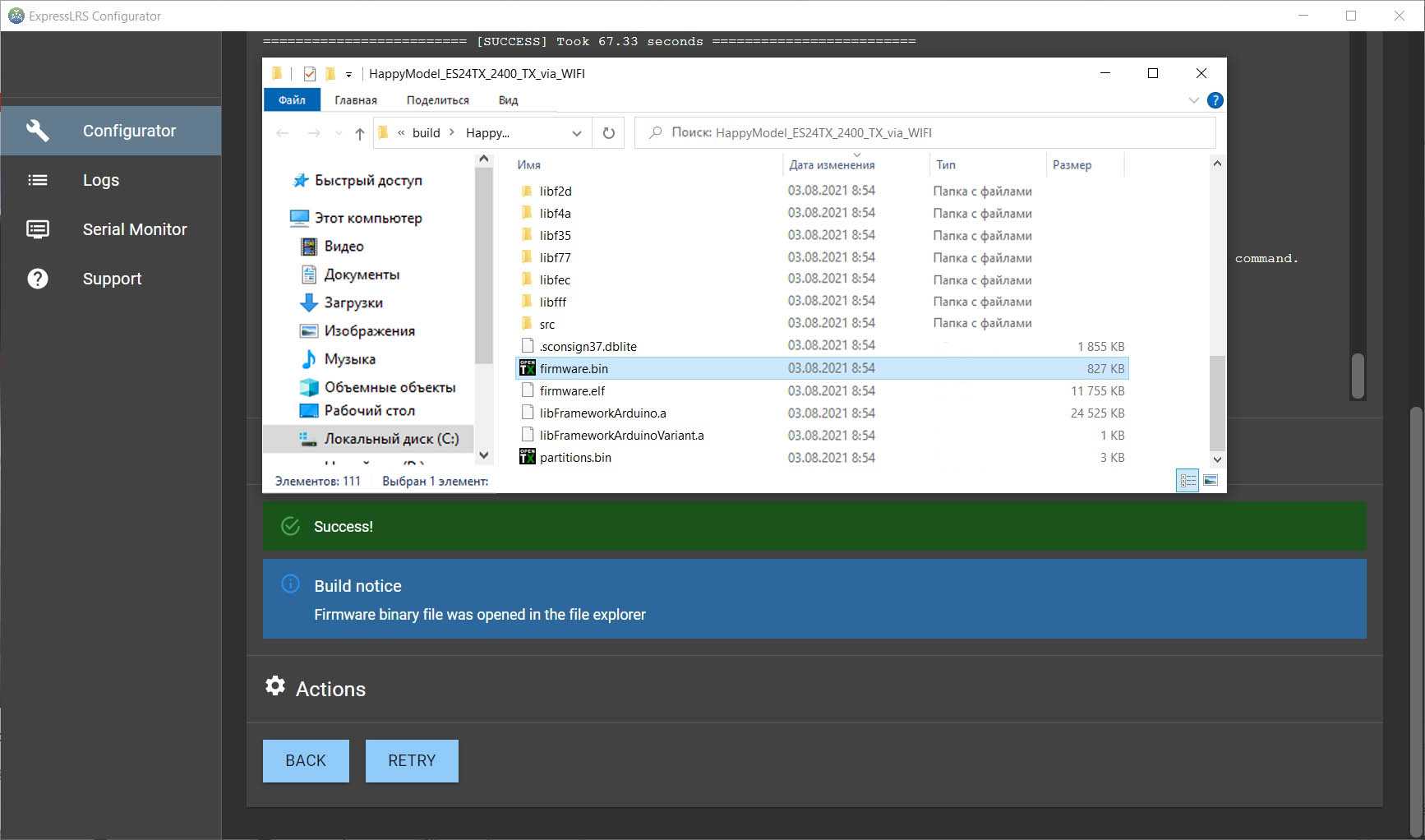 Шаг 4. По окончании компиляции Конфигуратор откроет папку с скомпилированным файлом firmware.bin: