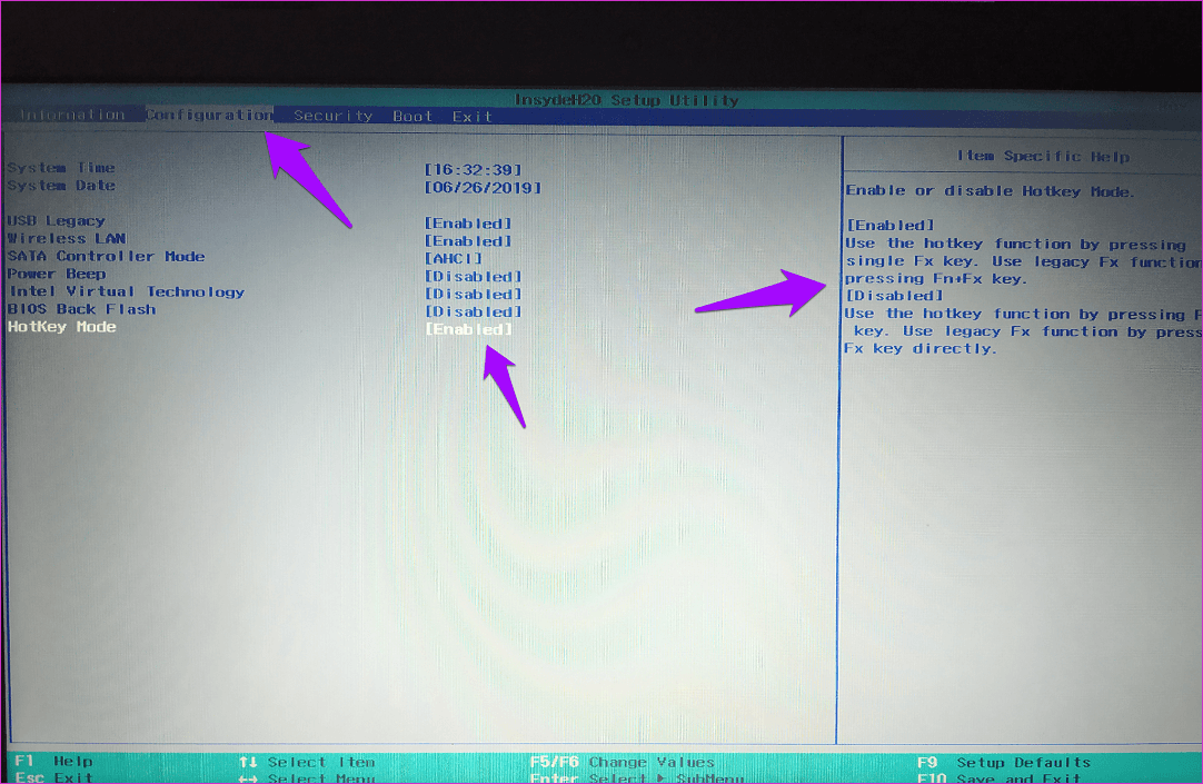 На вкладке «Конфигурация» используйте клавиши со стрелками для навигации, вы увидите режим HotKey. Отключите его, чтобы напрямую использовать устаревшую функцию Fx. В случае, если вы видите разные варианты, вам нужно самостоятельно найти параметры клавиш Function или Fx.