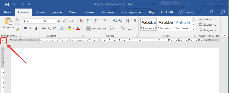 В левом верхнем углу текстового документа (над листом, ниже панели управления) в месте, где начинается вертикальная и горизонтальная линейки, находится значок табуляции. О том, что значит каждый из его параметров, мы расскажем ниже, а пока сразу перейдем к тому, как можно установить необходимую позицию табуляции.