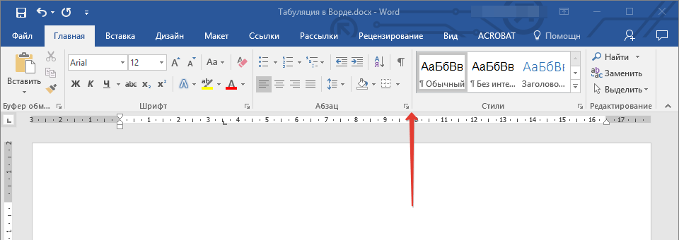 1. Во вкладке “Главная” откройте диалоговое окно группы “Абзац”, нажав на стрелочку, расположенную в правом нижнем углу группы.