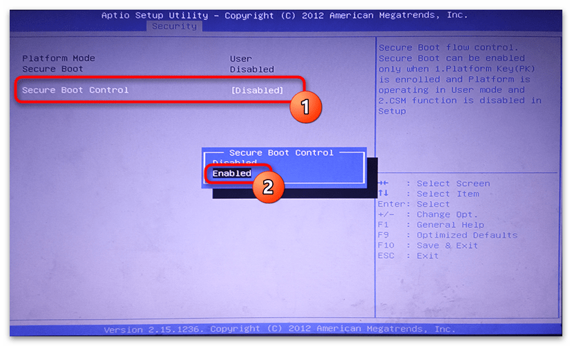 - Перейдите в упомянутую вкладку и зайдите в раздел «Secure Boot». Далее измените опцию «Secure Boot Control» из положения «Disabled» в «Enabled».
