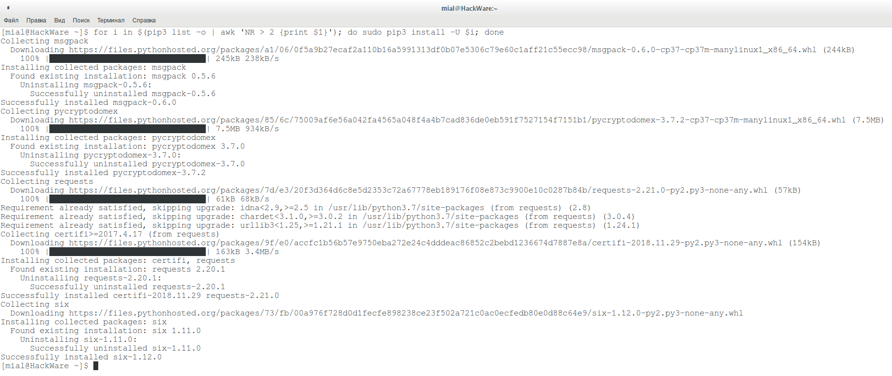 Её принцип заключается в том, что она составляет список всех пакетов Python, а затем каждый из них пытается обновить. Если обновления нет — то ничего страшного, просто происходит переход к следующему пакету из списка. Если обновление есть, то оно устанавливается и вновь происходит переход к следующему пакету из списка, пока программа полностью не завершит свою работу.