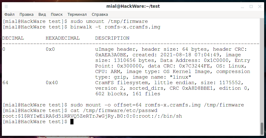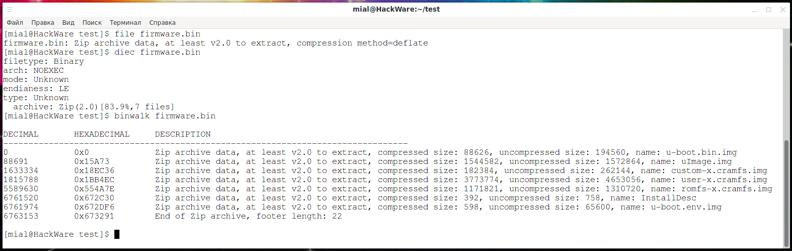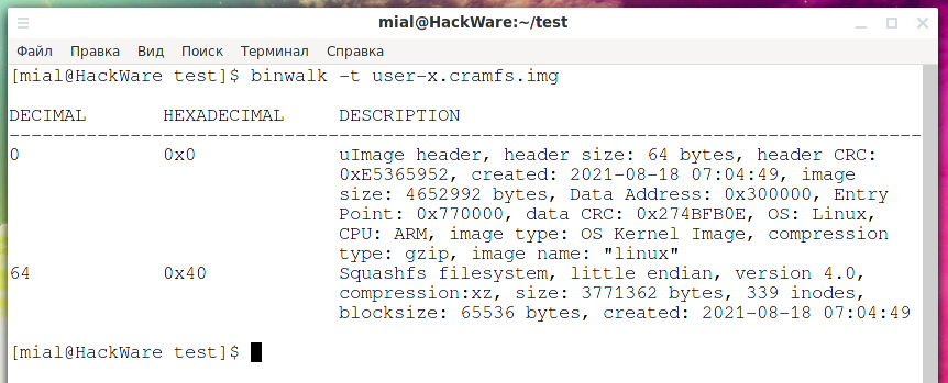Также воспользуемся утилитой Binwalk, которая специально предназначена для анализа прошивок: