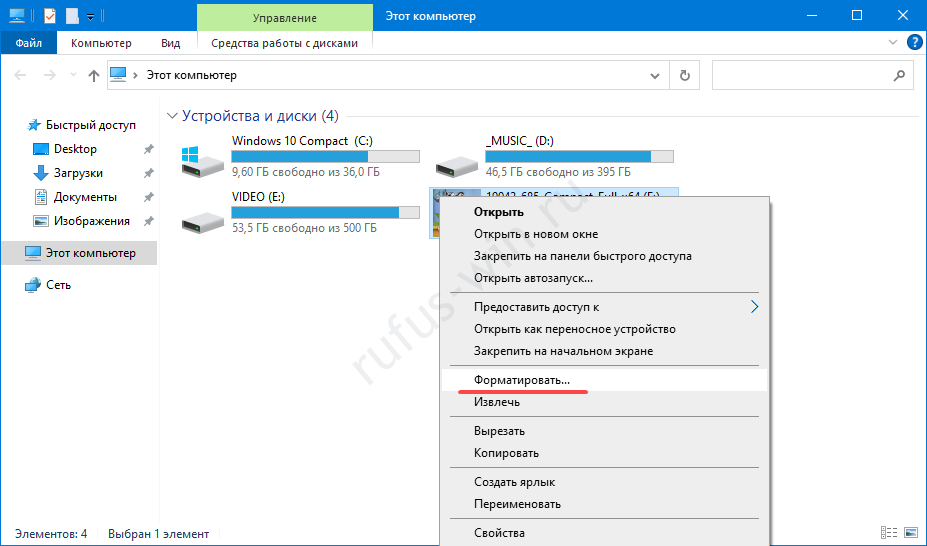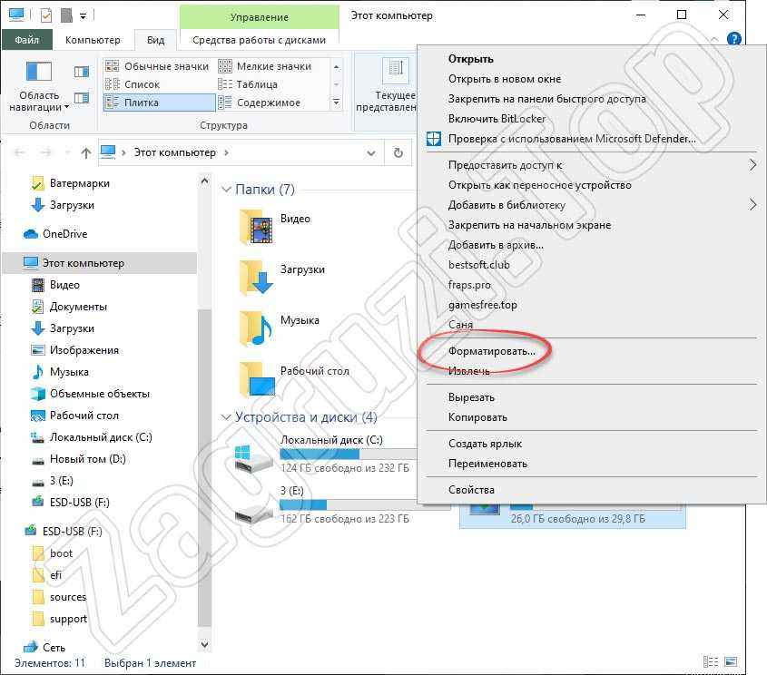 - Сначала устанавливаем флешку в USB-порт ПК или ноутбука. Дальше запускаем проводник Windows и, сделав правый клик по появившемуся накопителю, выбираем пункт, обозначенный на скриншоте ниже.