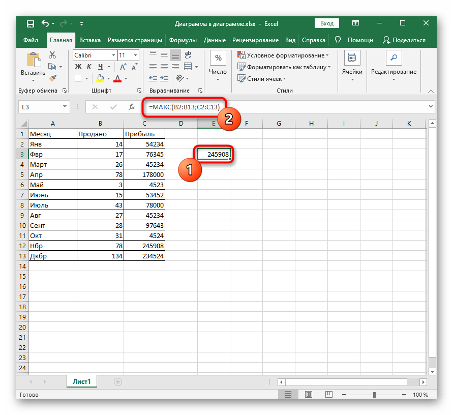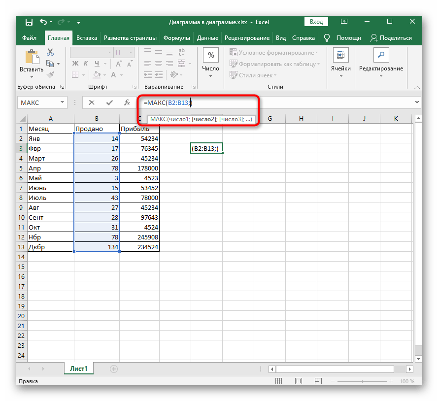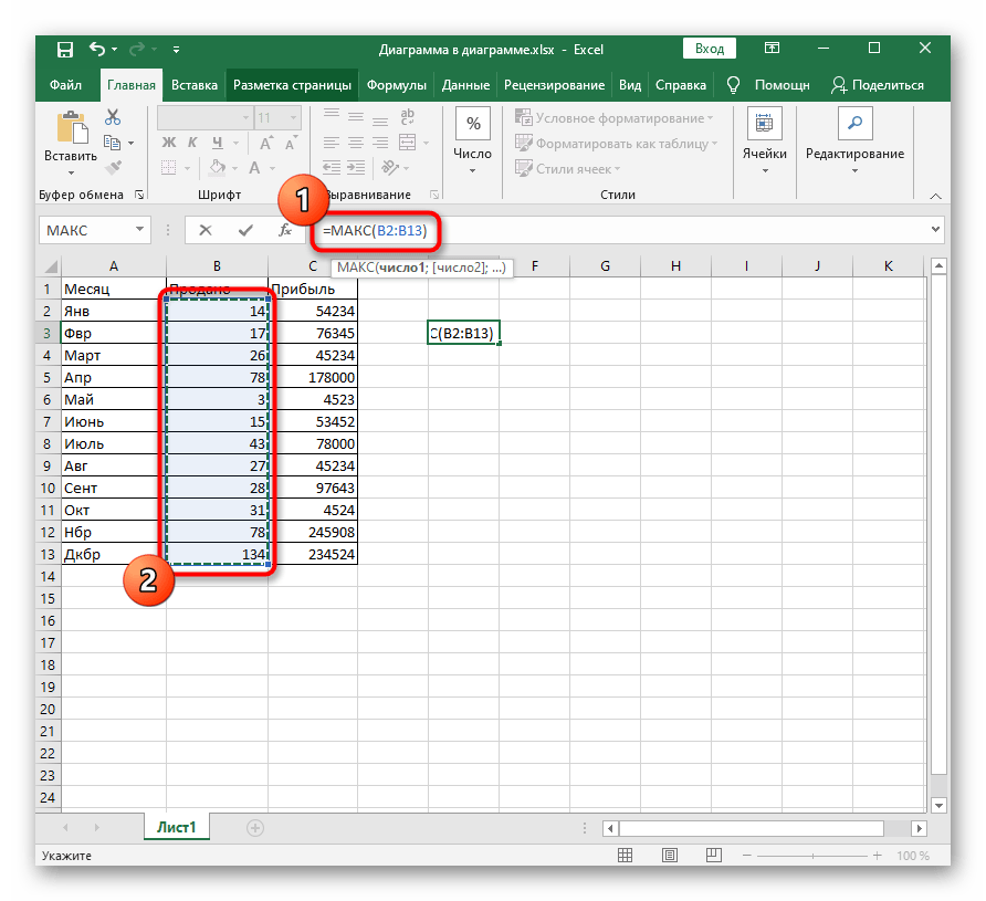 МАКС, как и другие функции, например самая распространенная СУММ, может включать в себя несколько списков аргументов и вычислять значения из всех них. Для этого заполняйте в таком же порядке идущие следом блоки «Число2», «Число3» и т. д.