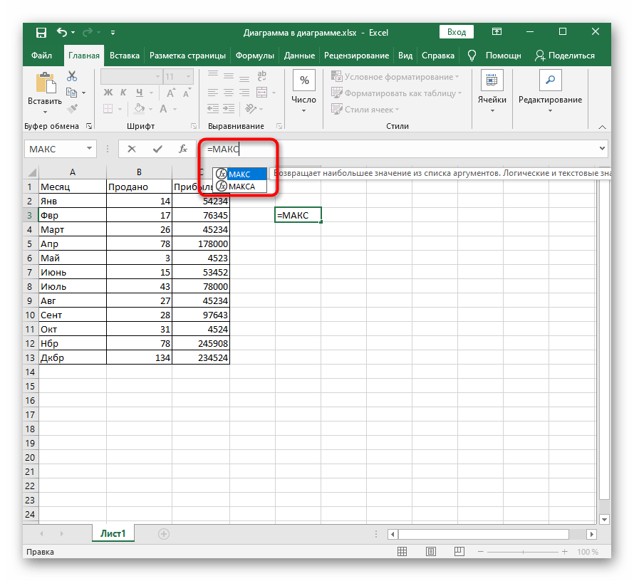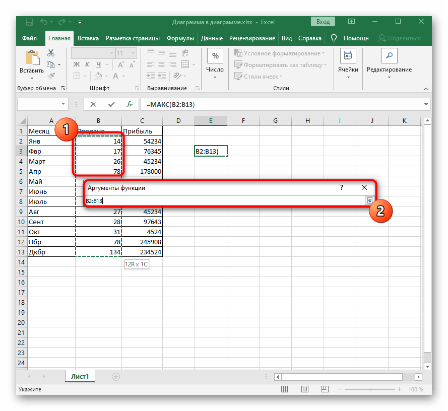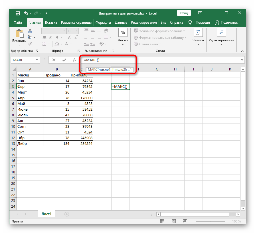 Как только произойдет выбор функции, отобразится отдельное окно, где заполняются ее аргументы. За пример мы взяли формулу МАКС, показывающую максимальное значение из всего списка аргументов. Поэтому в качестве числа здесь задается перечень ячеек, входящих в диапазон для подсчета.