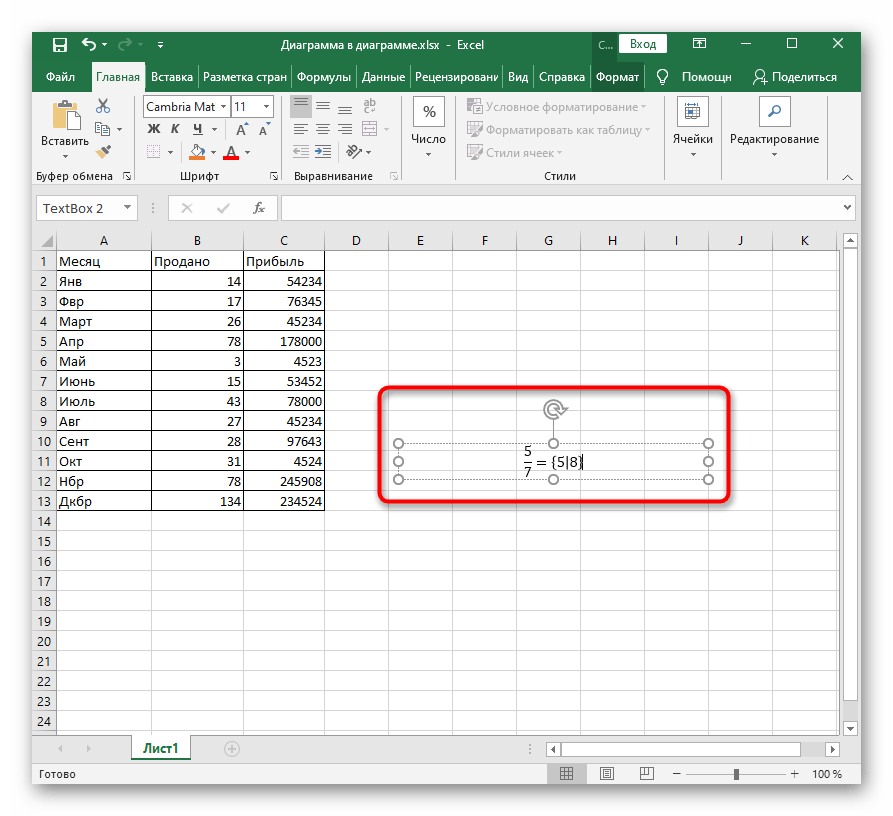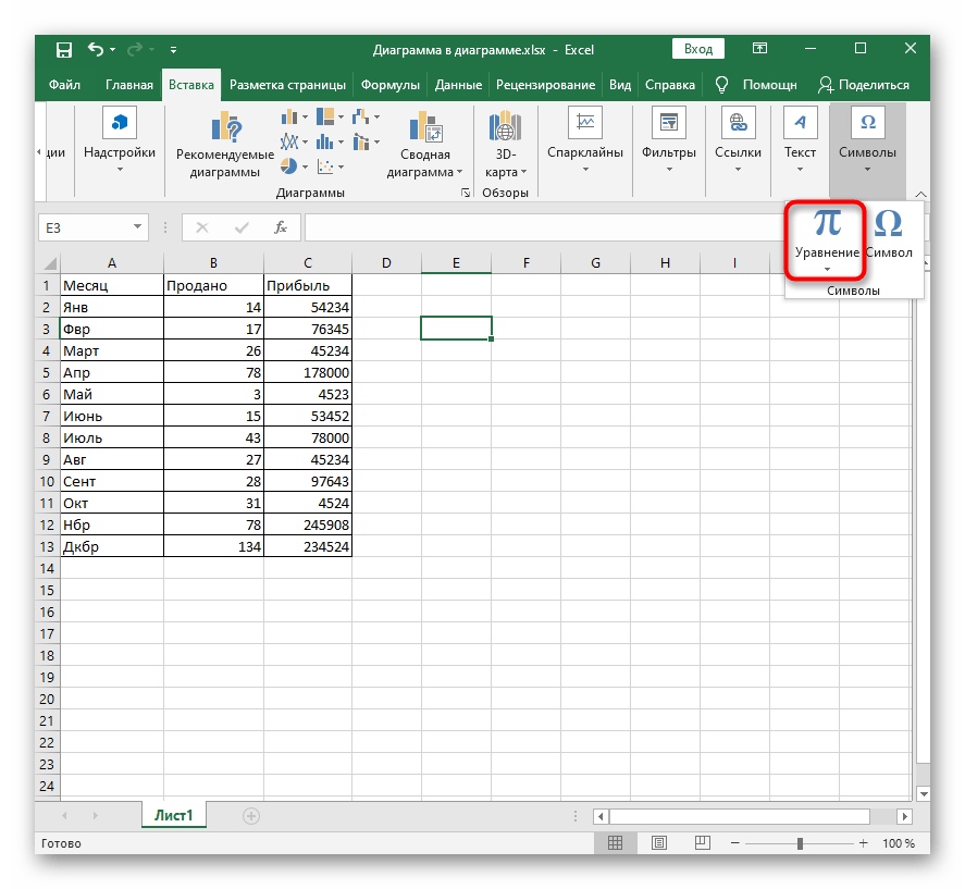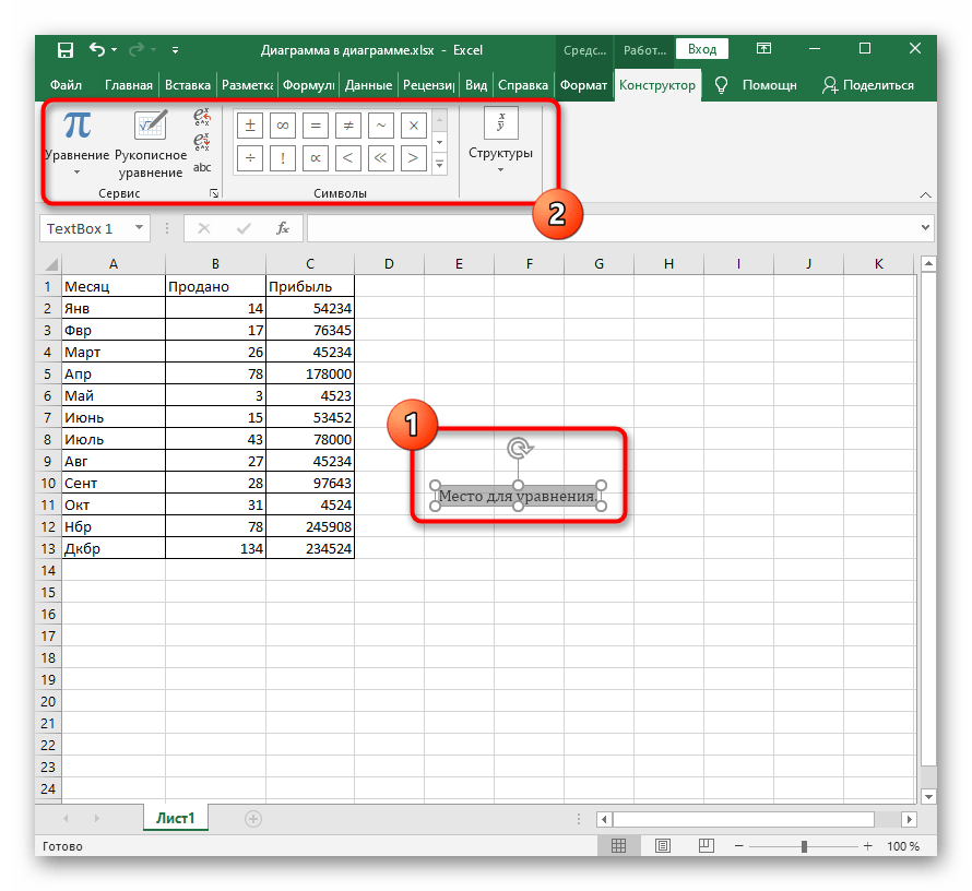 Последний вариант — вставка математической формулы или уравнения, что может пригодится всем тем пользователям, кто нуждается в создании подобных выражений в таблице. Для этого проще всего использовать специальный инструмент.