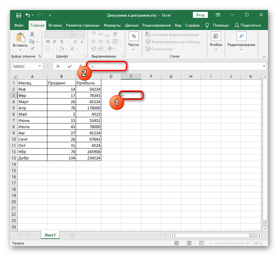 Напишите знак «=» в поле ввода вверху или в самой ячейке, что и будет означать начало формулы.