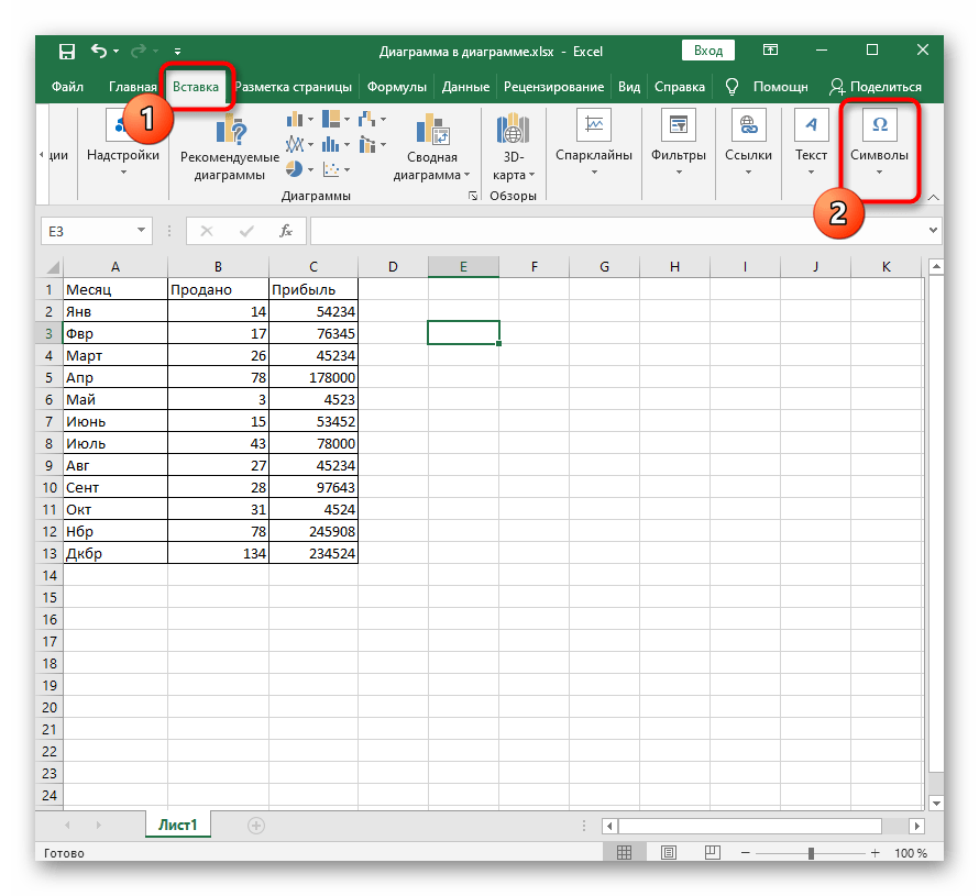- Откройте вкладку «Вставка» и разверните раздел «Символы».