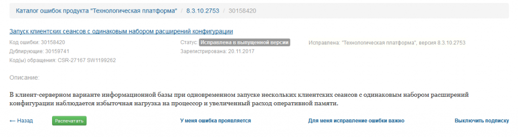 Стали разбирать инцидент совместно с фирмой «1С» в рамках ИТС КОРП. В результате была выявлена ошибка платформы 30158420, зафиксированная фирмой «1С» еще в ноябре 2017 года, но не исправленная на момент возникновения сложностей у нашего клиента. По итогам переговоров с корпоративной поддержкой «1С» информация об ошибке весной 2018 года была опубликована, а для нашего клиента выпустили внеочередную сборку платформы с исправлением. Вот суть ошибки:
