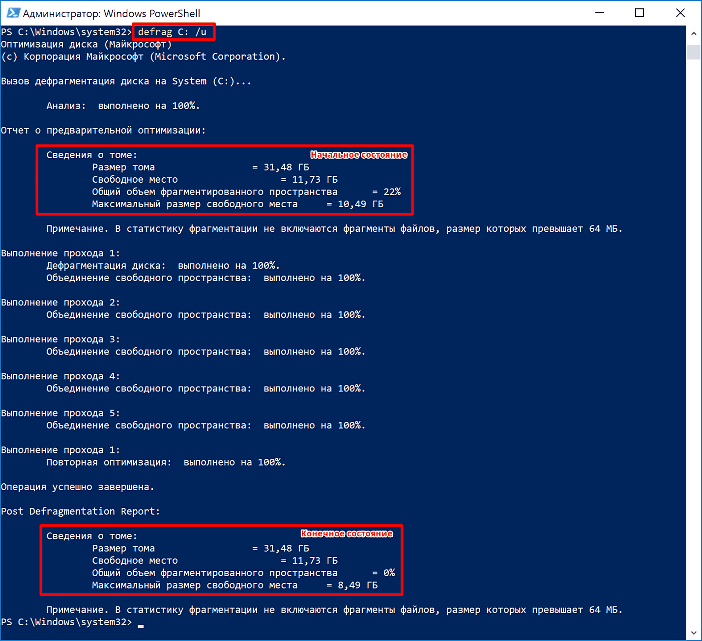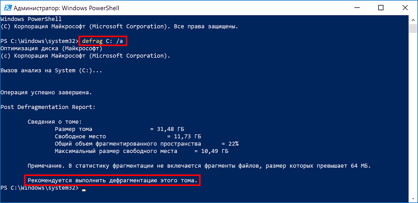 Являясь компонентом Windows, встроенный дефрагментатор, выросший из консольного приложения, может управляться из командной строки. Запускаем PowerShell с повышенными правами и проводим анализ состояния дисков.