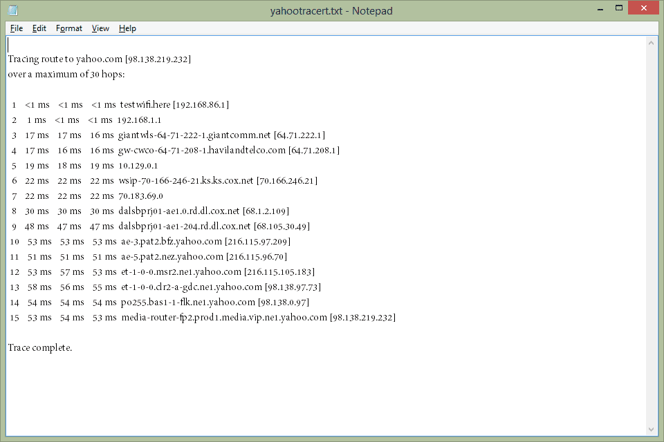 Файл yahootracert.txt (показанный выше) будет создан на диске Z: через несколько секунд после выполнения файла sample.bat. Как и в приведенных выше примерах, в файле показано все, что могла бы раскрыть командная строка, если бы не использовался оператор перенаправления.
