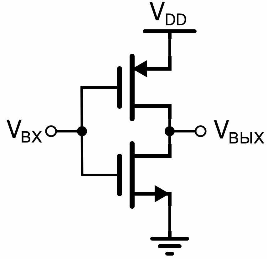 Если на входе присутствует высокий логический уровень, NMOS транзистор открыт, а PMOS транзистор закрыт. Таким образом, выход имеет низкоомное соединение с землей. Если на входе присутствует низкий логический уровень, ситуация меняется на противоположную, а выход имеет низкоомное соединение с VDD. Это называется двухтактным выходным каскадом, хотя это название не особенно информативно, поскольку оно не подчеркивает низкое сопротивление соединений, которые управляют выходом. В общем случае вы не можете напрямую соединять два двухтактных выхода, поскольку ток будет свободно протекать от VDD до земли, если на одном выходе выдается логическая единица, а на другом – логический ноль.