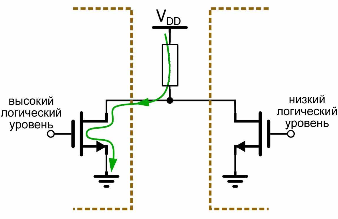 PMOS транзистор был заменен резистором, внешним по отношению к микросхеме. Если на входе присутствует высокий логический уровень, NMOS транзистор обеспечивает низкоомное соединение с землей. Но если на вход подается низкий логический уровень, NMOS транзистор выглядит как разомкнутая цепь, а это означает, что выход подтягивается к VDD через внешний резистор. Такой механизм приводит к двум важным отличиям. Во-первых, появляется неочевидное рассеивание мощности, когда на выходе низкий логический уровень, поскольку ток протекает через резистор, через канал NMOS транзистора на землю (в двухтактной схеме этот ток блокируется высоким сопротивлением закрытого PMOS транзистора). Во-вторых, выходной сигнал ведет себя по-другому, когда на выходе высокий логический уровень, так как выход подключен к VDD через гораздо более высокое сопротивление (обычно не менее 1 кОм). Эта особенность позволяет напрямую соединять два (и более) устройства с открытым стоком: даже если на одном из них низкий логический уровень, а на другом – высокий логический уровень, то подтягивающий резистор гарантирует, что ток не протекает свободно от VDD на землю.