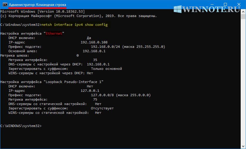 Первое что нужно сделать, это посмотреть сетевые соединения и IP-адреса, для этого запустите командную строку от имени администратора и выполните следующую команду: