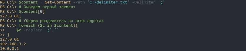 | 1 | $content=Get-Content-Path’C:\delimiter.txt’-Delimiter’;’ # Выведем первый элемент $content # Уберем разделитель во всех адресах foreach($cin$content){ $c-replace’;’,» } |