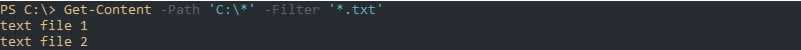 | 1 | Get-Content-Path’C:\*’-Filter’*.txt’ |