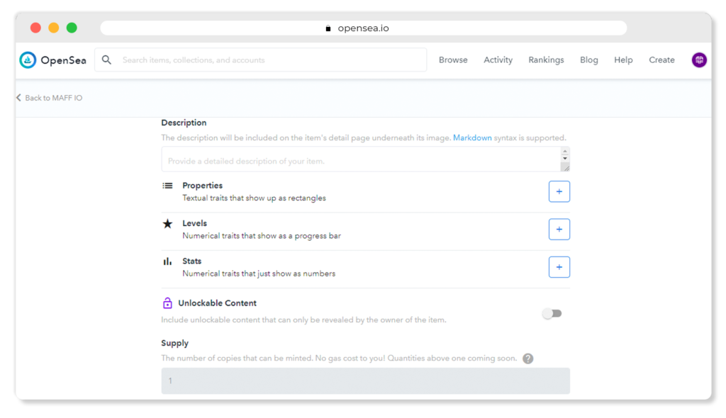- Unlockable Content. Разблокируемый контент — самая интересная функция NFT. Это та информация, которую смогут увидеть только те пользователи, которые купят предмет. Например, ссылка на файл в высоком разрешении. Или приглашение в закрытый чат в телеграмме. Все, на что хватит фантазии. Эксклюзивный контент позволит повысить ценность нашего NFT. Функцию можно оставить выключенной, если мы не будет ничего добавлять.